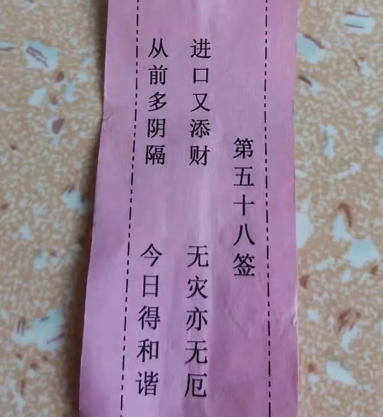 “Divination Slip Number 58 /pull into port and find riches /no misfortune or hardship /the clouds disperse / harmony from this day forth”